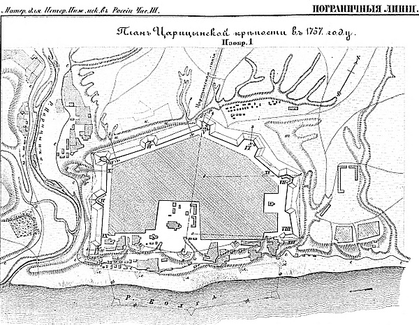 Город Царицын находится в 350 верстах от Саратова, лежит на правом берегу, на холме, невелик, построен в форме параллелограмма, с шестью больверками и башнями и заселён одними стрельцами, которых живёт в нём 400 человек. Стрельцы эти обязаны держать стражу против татар и служить охраной для проходящих мимо судов.