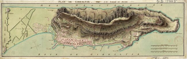 География Гибралтара определила его природные оборонительные преимущества. Северный и восточный склоны скалы практически неприступны, относительно ровное пространство вокруг мыса Европа окружено утёсами высотой до 30 м. Единственное пригодное для строительства поселения место — западная часть полуострова, но даже здесь склон достаточно крутой, чтобы обеспечить преимущество в обороне. Эти факторы в течение многих веков обеспечивали Гибралтару огромное военное значение[2].