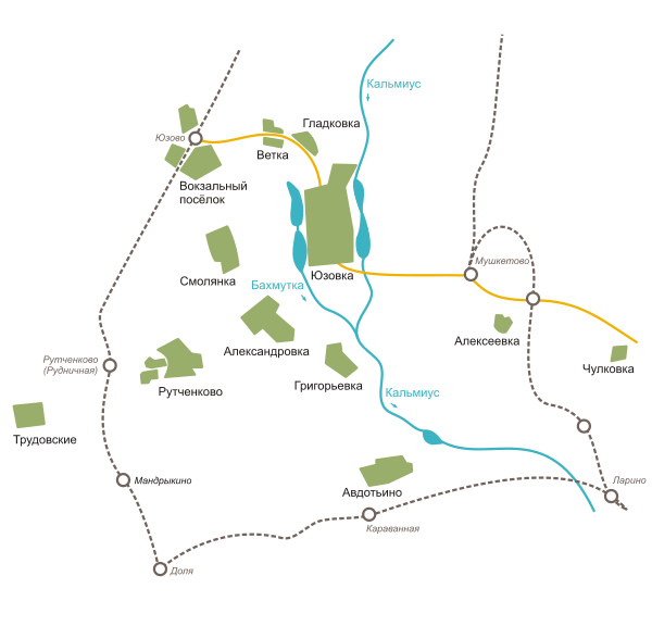 - Юзово (Донецк); от Юзово до металлургического завода проложена ветка протяженностью 10 верст — это был первый в Донбассе подъездной путь,