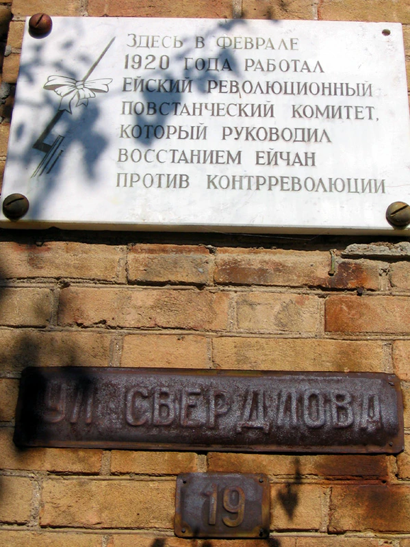 После Октябрьской революции 1917 года власть в Ейске переходила из рук в руки в общей сложности шесть раз [10]. На Ейском полуострове было своё противостояние «белых» и «красных». Символом красных являлся город Ейск. Казачьи же станицы Ейского полуострова выступали под Белым знаменем.