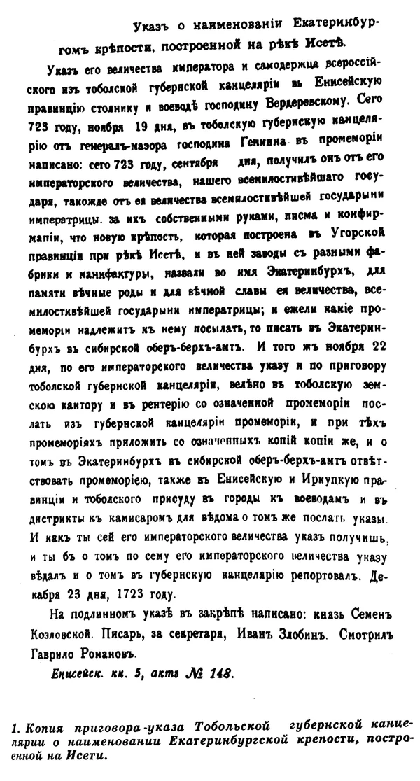 «…около сих заводов зачал крепость и осмелился до указа именовать Катериненбурх, а зовется Катериненбурхом в память Вашего Величества»