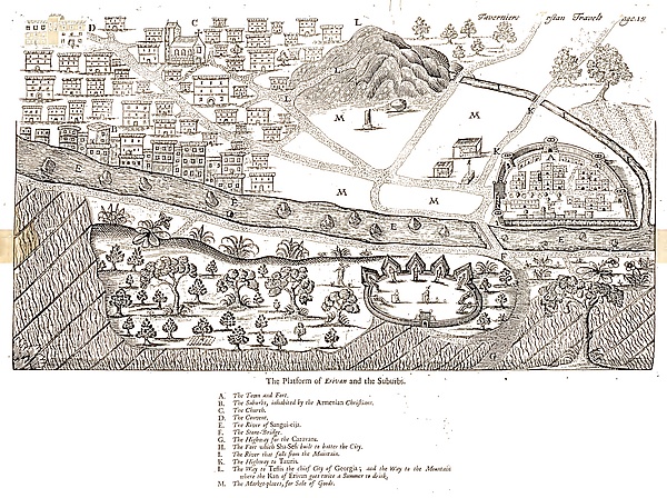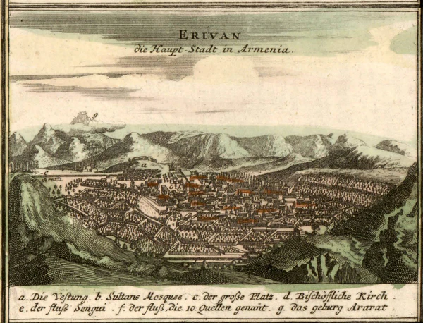 Важные данные об этническом составе города сообщает Исраэль Ори, посетивший Ереван спустя двадцать лет после землетрясения. В документе 1701 года Ори делит Ереван на собственно город и его крепость. Согласно ему, большинство населения города составляли армяне, он упоминает 200 домов мусульман[83]: «А буде не возможно тот город так хитростию взяти, возмут место все, в котором множество християн, а бусурман только с 200 домов, и войско в том месте». В этой статистике Ори, вероятно, подразумевал ту часть гарнизона города, который постоянно находилась в крепости в мирное время, его численность, по другим данным, мог достигать 2—3 тыс. человек[84]. В том же году посетивший Ереван Ж. Питтон де Турнефор называет город «столицей персидской Армении», упоминая его гарнизон числом в 2,5 тыс. человек[85]. Немецкий путешественник Гаспар Шиллингер, в соответствии с тогдашним представлениям, городом (stadt) считает только то, что заключалась в крепостных стенах, а собственно город, простирающаяся за крепостью, называет «пригородом» (Vor-Stadt). Он пишет, что «пригород» более чем в десять раз больше «города», и в котором в большинстве живут граждане армянского вероисповедания[86]. По данным католического миссионера Монье, армяне составляют 1/4 от 4 тыс. населения города (ville) и имеют четыре церквей. Однако здесь, как и у Шиллингера, под городом имеется ввиду только крепость, о чём он прямо указывал[87].