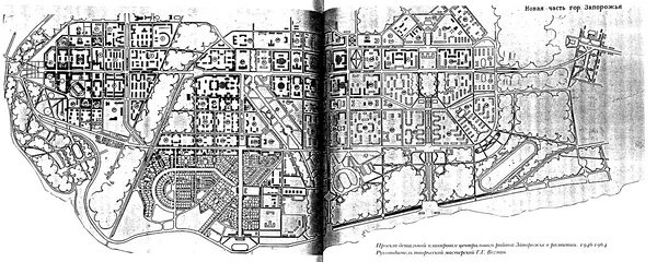 В середине 1928 г. профессор И. Г. Александров обратил внимание на необходимость плана развития города вокруг строящегося ДнепроГЭСа. Под руководством академика архитектуры И. В. Жолтовского была проведена подготовительная работа: проанализированы данные о местности, почве, климате, существующих коммуникациях. В сентябре того же года Совет Народных комиссаров УССР объявил конкурс на составление схемы планировки Большого Запорожья. В конкурсе участвовала бригада, возглавляемая академиком архитектуры А. В. Щусевым, и группа Харьковского политехнического института под руководством архитектора Б. В. Сакулина. 3 июля 1929 г. было вынесено решение о присвоении первой премии зодчим Украины. В апреле 1930 г. все работы по проектированию города были переданы во вновь созданный институт Гипроград УССР, а 29 апреля 1932 г. проект города был утверждён. Авторами проекта были И. И. Малоземов, П. П. Хаустов, архитекторы В. С. Андреев, А. М. Касьянов, С. М. Клевицкий, В. М. Орехов, Б. И. Приймак, экономист Г. В. Шелейховский. Новое Запорожье проектировалось как бы обособленно от старого Александровска, который при этом становился не основой, а лишь автономной единицей цельного градостроительного образования. И. И. Малоземов писал, что «Большое Запорожье … представляет собой город-созвездие, состоящий из отдельных районов, взаимосвязанных и обуславливающих друг друга и вместе представляющих единый городской организм». Проект предполагал создание 7 районов — Александровска, Воскресенки, района Днепрокомбината, Павло-Кичкаса, Кичкаса, острова Хортицы и резервного района Бабурки, с тем, чтобы в городе могло проживать около полумиллиона человек. С другой стороны, в основу планировки была положена схема «города-линии», то есть в основном районы располагались вдоль береговой линии Днепра на протяжении 22 километров[26]. Архитектурные качества проекта были настолько значительны, что макет его был представлен на Всемирной выставке 1939 г. в Нью-Йорке как образец высокой культуры социалистического градостроительства [1].