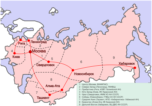 Проникновению в СССР высоких технологий из-за рубежа препятствовали созданный в 1949 году Координационный комитет по экспортному контролю (КОКОМ) и в целом «железный занавес» (однако существуют сведения об обходе ограничений КОКОМа советскими спецслужбами[31]). Внутреннему развитию сетей препятствовала «борьба с кибернетикой» 1950-х. Тем не менее с 1974 года на базе ленинградского ФТИ им. Иоффе начинает развиваться вычислительный центр общего пользования, который в 1978 году был преобразован в отдельный научно-исследовательский институт информатики и автоматизации (ЛИИАН). Вокруг него начинает стихийно строиться всесоюзная компьютерная Академсеть, в Москве учреждается институт ВНИИПАС как её центральный узел, он устанавливает регулярную спутниковую цифровую связь со странами соцблока и организует с 1982 года через Австрию выход в цифровые сети «капиталистических стран». Надзор за этой деятельностью вела Комиссия по вычислительным центрам коллективного пользования и сетям ЭВМ Координационного комитета АН СССР по вычислительной технике. Масштабные планы по развитию Академсети прервались в 1991 году вместе с распадом СССР, причём в 1992 году были физически уничтожены обслуживавшие её советские ЭВМ. Однако в 1995 году оставшиеся от Академсети оптические кабели были снова использованы для построения новой сети РОКСОН — «Региональной объединённой компьютерной сети образования и науки», спроектированной как локальная сеть в рамках Интернета с центром в СПбНЦ РАН (сеть объединила научные учреждения постсоветского Петербурга, способствуя их информационному развитию)[3].