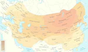 Тюркская степь вошла в состав трёх монгольских улусов, которые возглавили сыновья Чингисхана: большая (степная) часть, весь восточный Дешт-и-Кипчак от Балхаша до Нижнего Поволжья, вошла в состав улуса старшего сына Джучи; Туркестан, Семиречье, Мавераннахр и Восточный Туркестан — в улус второго сына Чагатая; северо-восточная часть Семиречья, Тарбагатай, районы верхнего Иртыша и Западная Монголия — в улус третьего сына Угэдея[31]. Чингизиды стремились превратить свои улусы в независимые владения. После смерти Чингисхана, последовавшей в 1227 году, эта тенденция стала нарастать, и империя распалась на несколько независимых государств. Преемником Джучи, умершего в том же, 1227 году, стал его средний сын Бату.