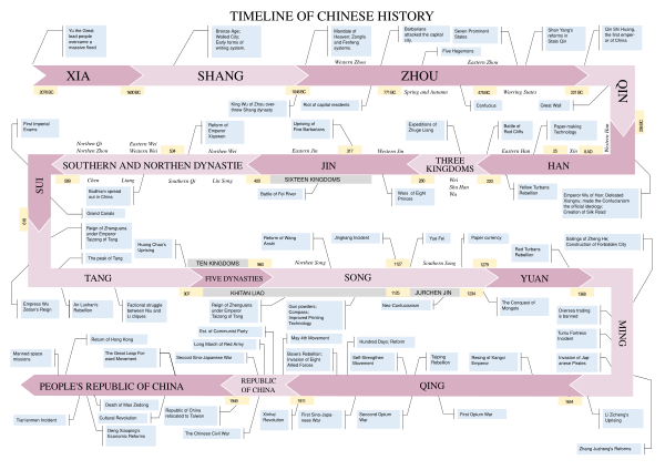 Первый период, скупо документированный, занимает примерно такой же временной промежуток, как и второй; второй период, в свою очередь, иногда делят на Ранний (до конца Тан) и Поздний (до конца Цин). При этом необходимо учитывать, что традиционная китайская историография включает суверенные государства других народов (монголов, маньчжуров, тибетцев и др.) в хроникально-династийную историю собственно Китая, игнорируя собственные исторические традиции этих народов и рассматривая их государства как части Китая.