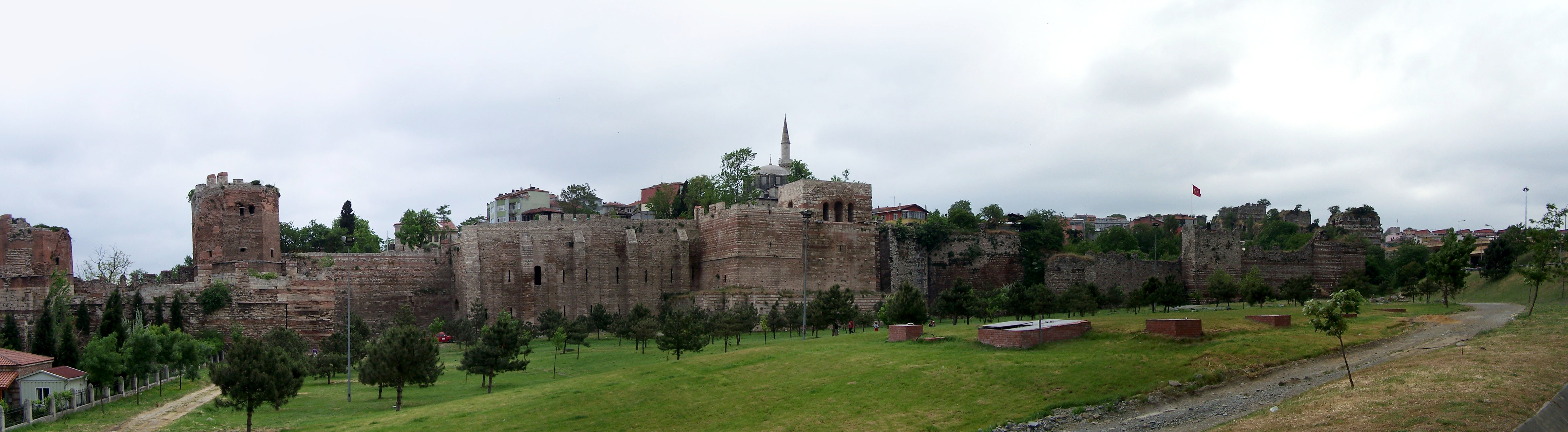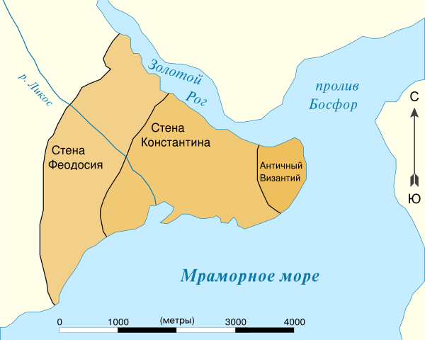 Общая протяжённость крепостных стен Константинополя составляла 16 км, по их периметру насчитывалось около четырёхсот башен. Стены Феодосия, пересекавшие Босфорский мыс от Мраморного моря до залива Золотой Рог, достигали в длину 5,5 км и были самыми мощными. Эти стены были возведены в три ряда (с учётом укреплений, достроенных позже, после разрушительного землетрясения 447 года). Первый ряд стен, высотой 5 м, защищал глубокий и широкий ров с водой (он имел 20 м ширины, а глубина местами доходила до 10 м). Второй ряд, имевший 2—3 м в ширину и 10 м в высоту, усиливали 15-метровые башни. Третий ряд, наиболее массивный, достигал в толщину 6—7 м и был защищён башнями высотой от 20 до 40 м. Башни были оборудованы устройствами для метания камней и поливания противника горячей смолой или маслом. Вдоль стены располагались караульные помещения для стражи и небольшие хранилища провианта и боеприпасов. Основания стен Феодосия уходили на 10-20 м под землю, что практически исключало возможность подкопа. Через ров не было построено стационарных каменных мостов, лишь лёгкие деревянные, которые убирались на ночь, а при осаде быстро уничтожались защитниками города[23][24].
