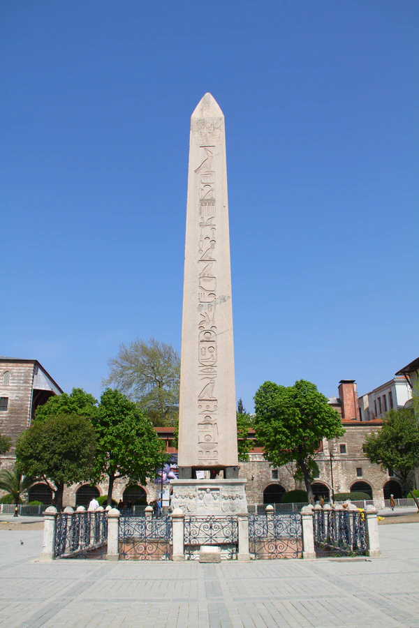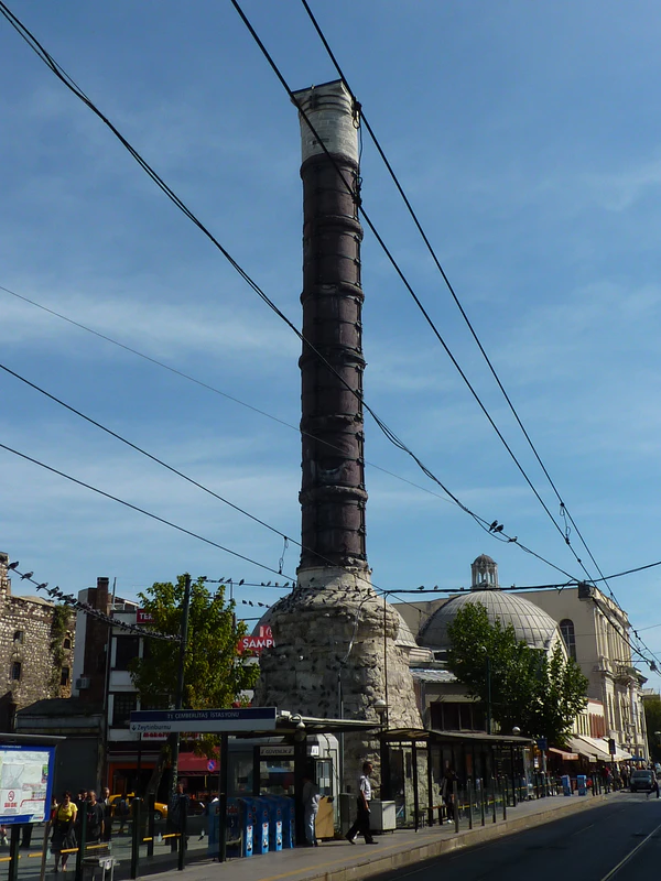 К площади Августеон примыкало большинство наиболее значимых достопримечательностей Константинополя — ворота Халки (Халка), служившие парадным входом в императорский дворец[комм. 19], здания сената и императорской библиотеки, роскошные дворцы знати, Термы Зевксиппа (куда свозились наиболее ценные произведения искусства со всей Римской империи), храм Святой Софии и резиденция патриарха, ипподром и Милий (или Милиарий)[комм. 20]. Вымощенный мраморными плитами круглый Форум Константина был богато украшен колоннами (в центре возвышалась знаменитая колонна Константина Великого), портиками и триумфальными арками. Рядом находились большой рынок булочников и переулок «Долина слёз», в котором велась торговля рабами. Квадратный Бычий форум (или площадь Быка) был украшен триумфальной аркой и базиликой Феодосия. От него Меса расходилась в две стороны — главная магистраль шла на запад, к Золотым воротам, и далее переходила в римскую Эгнатиеву дорогу; другая часть Месы шла на северо-запад к Адрианопольским (или Харисийским) воротам. В центре Воловьего форума стояла привезённая из Пергама громадная бронзовая фигура быка, чрево которого служило печью, в которой сжигали приговорённых к такой мучительной смерти преступников[42][2].