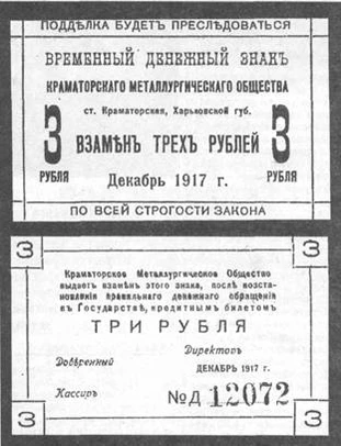 1917 год — из-за нехватки денежной массы для расчетов с рабочими и инженерно-техническим персоналом дирекция выпустила временные денежные знаки достоинством 1, 3, 5, 10, 25 и 100 рублей. Бумага бонов КМО имела защиту — водяные знаки, но в обращение они так и не поступили.