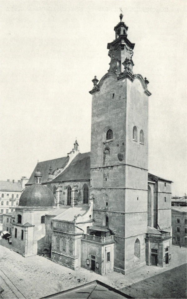 На площадь Рынок выходит алтарь кафедрального собора Успения Девы Марии (Латинский собор), построенный в готическом стиле. С 1412 года он стал центром львовского римско-католического архиепископства (основанного в 1375 году в Галиче). Также в центре города было построено несколько костёлов в готическом стиле — костёл Святого Духа, костёл Божьего Тела с монастырём доминиканцев, костёл Святого Креста с монастырём францисканцев, за стеной с юго-востока костёл Св. Андрея с монастырём бернардинцев, несколько часовен. Зато русины имели только одну православную церковь Успения Богородицы на восточной окраине центра города.
