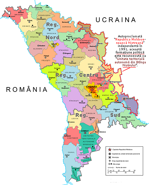 - В 1990 на фоне тенденций по интеграции Молдавии в Румынию в юго-восточных регионах республики среди местного славянского населения усилились сепаратистские настроения, которые привели к созданию Приднестровской Молдавской Республики со столицей в Тирасполе (см. Приднестровская Молдавская Республика). Это спровоцировало Приднестровский конфликт 1990—1992, который достиг своей кульминации в марте 1992, когда Кишинёв попытался восстановить контроль над городом Дубоссары, и в июне 1992, когда развернулась ожесточенная битва за Бендеры между правительственными войсками Молдавии и гвардейцами Приднестровья, которых поддерживали добровольцы из других стран, главным образом из России. Конфликт был заморожен благодаря вмешательству частей российской 14-й армии летом 1992 года.