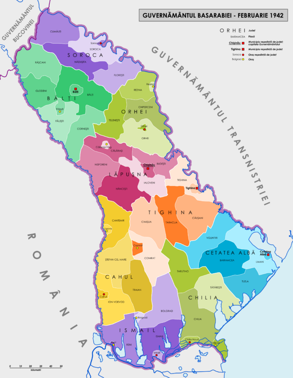 - В 1940 в результате подписания Пакта Молотова — Риббентропа Бессарабия была присоединена к СССР и провозглашена Молдавской ССР, в состав которой вошли 9 бессарабских уездов и 6 районов Левобережья Днестра, входивших до этого в состав Украинской ССР. (В состав нынешней Республики Молдова не вошли земли Южной Бессарабии и Северной Буковины, вошедшие в состав Украины). Это произошло после того, как по дополнительному соглашению между Шуленбургом и Молотовым было переселено немецкое население с Юга Бессарабии (около 100 тыс.) и из Северной Буковины (ок. 14 тыс.) в Германию. Взамен, на освободившихся территориях, были организованы совхозы, куда приглашалось население с Украины. К Молдавской ССР отошёл 61 населённый пункт с населением 55 тыс. человек (46 населённых пунктов Бендерского уезда, 1 населённый пункт Кагульского уезда, 14 населённых пунктов бывших районов МАССР). К Украинской ССР отошли 96 населённых пунктов с населением 203 тыс. человек (76 населённых пунктов Хотинского уезда, 6 — Измаильского и 14 Аккерманского уездов). Эти изменения мотивировались тем, что в населённых пунктах, переданных Молдавской ССР, преобладало молдавское население, а в переданных Украинской ССР — украинское, болгарское и русское население. В результате территория МССР составила 33,7 тыс. км², население — 2,7 млн человек, из которых 70 % составляли молдаване. Столицей республики стал город Кишинёв. Молдавская ССР, после передела Бессарабии потеряла 10 тыс. км² территории и 0,5 млн чел. населения. В 1940 году было депортировано и репрессировано 8 тыс. чел коренного населения, а 13 июня 1941 — ещё около 32 тыс. чел.