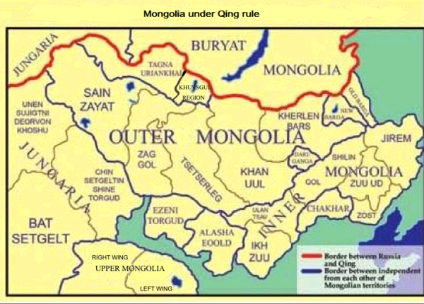 В составе Цинской империи территория Внешней Монголии представляло собой отдельное имперское наместничество, поделённое на четыре ханства (аймака) и пограничный Кобдоский округ, расположенный на крайнем западе по соседству с Синьцзяном. Аймаки в свою очередь делились на хошуны — традиционные для Монголии феодальные уделы, имевшие относительно чёткие границы. Однако при маньчжурских императорах хошуны из наследственных владений превратились во временные пожалования, ибо для вступления в наследственное владение и управление требовалось получение монгольскими князьями инвеституры от императора, считавшегося верховным собственником всех монгольских земель. С целью ослабления влияния князей цинские власти дробили аймаки на всё новые хошуны, доведя их число с восьми в 1691 году до 111 к XIX веку.