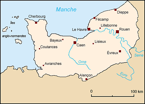Эти земли, населённые поначалу кельтскими племенами (армориканцами в западной части и белгами в восточной), в 56 году до н. э. были покорены римскими легионами и затем присоединены императором Октавианом Августом к провинции Лугдунская Галлия. В IV веке император Грациан разделил провинцию на цивитаты (гражданские общины), сформировав таким образом исторические границы провинции. После падения Древнего Рима в V веке эти земли перешли под власть франков, короли которых поощряли развитие христианского монашества — в Нормандии основаны аббатство Сент-Уэн в Руане (около 641 года), Фонтенельское аббатство (около 649 года) и аббатство Жюмьеж (около 654 года), — а также замену пагов на цивитасы с последующей интеграцией земель Нормандии в Каролингскую империю. В конце VIII века на эти земли вторглись грабители викинги; они обосновались здесь и в 911 году образовали своё княжество, которое впоследствии стало герцогством Нормандия. После расширения территории, непрерывно происходившего на протяжении полутора веков, границы Нормандии закрепились и не менялись существенно, охватывая территорию двух современных французских регионов — Нижней Нормандии (департаменты Манш, Кальвадос, Орн) и Верхней Нормандии (департаменты Эр и Приморская Сена). Включенная в 1204 году в состав земель французской короны[1], Нормандия понесла огромный ущерб в эпоху Столетней войны, а также в период французских религиозных войн, поскольку Нормандия была одним из главных центров протестантизма во Франции. В XX веке в ходе военной операции по высадке союзников было разрушено множество городов этой исторической области, в особенности Сен-Ло, Гавр и Кан.