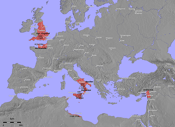 Небольшая горстка норманнов отправилась испытывать свою судьбу в Средиземное море. Удача была на их стороне; им даже удалось основать новую династию. Это были сыновья мелкого нормандского дворянина Танкреда де Готвиля — Вильгельм Железная Рука, Роберт Гвискар, Рожер де Готвиль, и затем сын последнего Рожер II, ставший первым королём Сицилии. Норманны южной Италии сыграли существенную роль в истории Византии и в крестовых походах.
