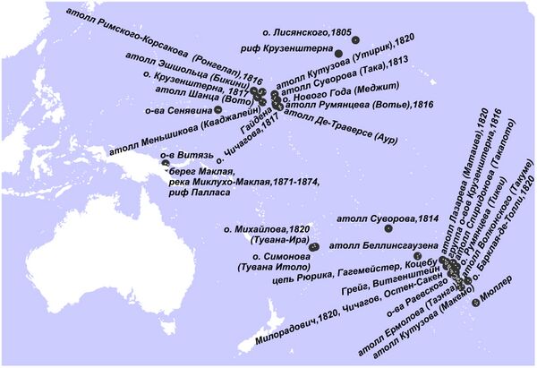 В Российской Империи после открытия В. Берингом в 1741 году северо-западного побережья Америки, купеческие компании при поддержке сибирской администрации до конца XVIII века организовали около 90 промысловых экспедиций в Тихий океан. Государством была учреждена Российско-американская компания (1799—1867 гг.), занимавшаяся административными вопросами и торговлей на Аляске и в Тихом Океане. В мае 1804 года к Гавайским островам подошли два корабля «Надежда» и «Нева». Это были первые корабли русских, совершавшие кругосветные плавания[6]. В сердце тропической части Тихого океана есть атоллы и острова Россиян, Суворова, Кутузова, Лисянского, Беллинсгаузена, Барклай-де-Толли, риф Крузенштерна и многих других. Ещё одна отличительная сторона всех состоявшихся путешествий — взаимная дружелюбность в истории встреч русских и народов Тихого океана.