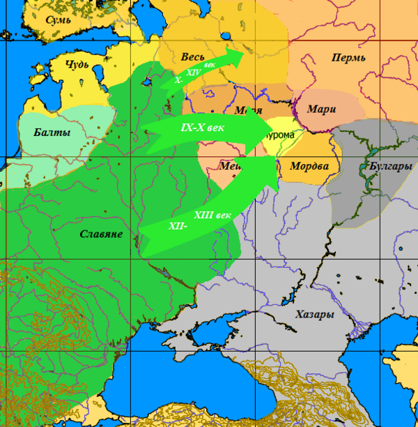 С V века земледельческие племена древних славян начали заселять междуречье Днепра и Десны, земли по берегам озёр Ильмень и Псковское, а затем междуречье Волги и Оки[14]. В процессе контактов славян с местными или также пришлыми балтскими и угро-финскими племенами постепенно складывались культурно-языковые различия между племенными союзами. После VII века произошло разделение славян на восточных, западных и южных[15].