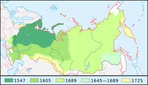 Русские землепроходцы, казаки и промышленники продолжали освоение Сибири. В 1648 году Ф. А. Попов и С. И. Дежнёв открыли пролив между Азией и Америкой. Отряды В. Д. Пояркова, Е. П. Хабарова вышли в Приамурье. В своём движении на север и восток Сибири Россия сталкивалась лишь с эпизодическим сопротивлением. К концу XVII века русские вышла к естественным рубежам — берегам Ледовитого и Тихого океанов[137][138]. Включение в состав России привело к ускорению общественного развития сибирских народов[139].