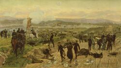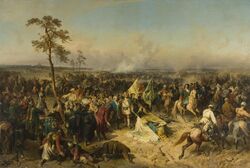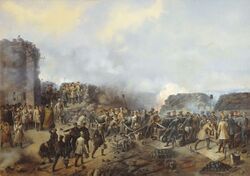 В 1812 году в Россию вторглась «Великая армия» Наполеона. Началась Отечественная война[216], которая быстро приобрела народный характер[217][218]. 26 августа (7 сентября) 1812 года состоялось Бородинское сражение[219]. Желая сохранить боеспособность русской армии, главнокомандующий М. И. Кутузов принял решение оставить Москву. Занятый неприятелем город сгорел[220][221]. После сражения под Малоярославцем французы были вынуждены отступать по уже разорённой старой смоленской дороге — под ударами русской армии и партизан[222]. В декабре 1812 года последние наполеоновские солдаты покинули территорию Российской империи[223][224][225]. Негативные последствия иностранного нашествия ощущались на протяжении 50 лет[226][227].