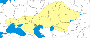 Со второй половины IV века территории современной России были включены в процесс Великого переселения народов[11]. Кочевые племена создавали собственные государственные образования, в том числе Тюркский каганат[12], Великую Булгарию, Хазарский каганат[13].