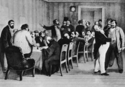 В 1833 году министр народного просвещения С. С. Уваров выдвинул постулат о том, что национальными началами России являются православие, самодержавие и народность. Теория официальной народности стала идеологической основой правления Николая I[251][252]. В ответ в среде либерально настроенных дворян была сформулирована концепция об изначальной отсталости страны[253][254]. Споры по поводу миссии России привели к возникновению в конце 1830-х годов славянофильства и западничества[255][256]. В 1840-х годах начали распространяться идеи социализма[257][258]. После серии революций в Европе 1848 года цензура в Российской империи была ужесточена до предела[259][260].