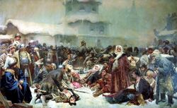 После смерти Александра I в 1825 году в империи возникло междуцарствие. Этим воспользовались группы радикально настроенных офицеров. Ранее они создали тайные Южное и Северное общества, планируя прийти к власти, чтобы ликвидировать крепостное право, ограничить сословные привилегии и установить представительское правление[238][239][240]. Северное общество попыталось поднять восстание в Санкт-Петербурге в день принесения присяги Николаю Павловичу — 14 (26) декабря 1825 года. Мятеж потерпел поражение[241][242].