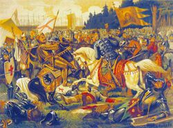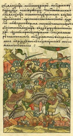 Основным соперником Москвы в споре за объединение русских земель стало Великое княжество Литовское и Русское[42]. К концу XIV века оно включило в свой состав бо́льшую часть бывшего Древнерусского государства[43]. В результате Кревской унии 1385 года с Польским королевством языческая литовская знать приняла католичество. В дальнейшем это помешало претензиям Вильно на православные русские земли[44].
