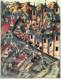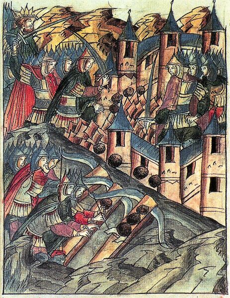 Внутриполитические преобразования сопровождались внешнеполитическими успехами. В 1552 году русские войска завоевали Казанское ханство[72], в 1556 году в состав Русского царства вошло Астраханское ханство. К концу 1550-х годов Москва получила выход к Каспийскому морю[73]. Во время первого периода Ливонской войны русские войска взяли Нарву, Дерпт и Полоцк[74].
