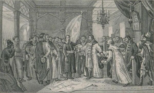 В 1653 году запорожские казаки, которые подняли восстание против Речи Посполитой, обратились к царю с просьбой принять подконтрольные им территории в состав Русского государства. В октябре 1653 года Земский собор в Москве дал на это согласие. В январе 1654 года восставшие на Переяславской Раде подтвердили решение о переходе «Запорожского войска» в русское подданство[130][131]. Это привело к русско-польской войне. По её итогам Россия вернула себе Смоленскую и Северскую земли. Речь Посполитая также признала власть Москвы над землями по левому берегу Днепра и Киевщиной[132][133].