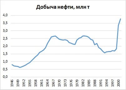 В данный период наблюдался быстрый рост нефтяной отрасли. В ходе крупномасштабных геологоразведочных и буровых работ были открыты нефтяные месторождения Тунгор и Колендо. Началось применение вторичных методов добычи нефти. Это позволило нарастить ежегодную добычу нефти за 1953—1964 годы почти в три раза, с 800 тысяч до 2,2 млн тонн[22].