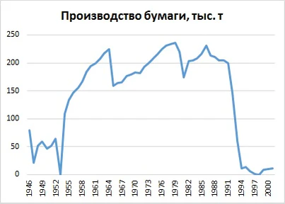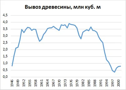 Лесная и целлюлозно-бумажная отрасли промышленности достигли пика своего развития. В 1975 году вывозка древесины составила 3,9 млн кубических метров, после чего в отрасли начался спад. Это было связано с истощением запасов древесины (ель и пихта) вследствие 70-летней активной эксплуатации лесов и лесных пожаров. Местные ЦБЗ за весь период так и не смогли выйти на показатели, определенные советским руководством в 1964 году, по производству целлюлозы (500—600 тысяч тонн) и бумаги (250—300 тысяч тонн)[27].