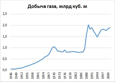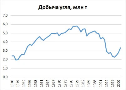 Угледобыча в начале рассматриваемого периода развивалась устойчиво: внедрялись средства автоматизации, увеличивалось количество горных машин и комбайнов. Шахтеры обеспечивали углем всех потребителей области, в отдельные годы даже наблюдались сложности со сбытом топлива. В 1979 году добыча угля достигла максимального за весь советский период значения в 5,8 млн тонн. В 1980-е годы начался спад отрасли из-за выбытия мощностей, к тому моменту действовали 13 шахт, Лермонтовский и Новиковский угольные разрезы. Так, в 1984 году добыча составила 4,7 млн тонн, что было меньше уровня 1965 года. При этом потребности региона в угле составляли 5,5 млн тонн, в результате область нуждалась в привозном угле[28]. Если в общем топливном балансе страны уголь в конце 1970-х годов составлял около половины, то в Сахалинской области — почти три четверти[29].