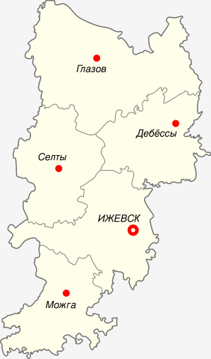 Вотская Автономная область образована декретом ВЦИК от 4 ноября 1920 года и 5 января 1921 года были определены её границы. В состав автономии вошли части Глазовского, Елабужского, Малмыжского и Сарапульского уездов Вятской губернии. Первоначально административным центром был определён город Глазов, но уже 2 июня 1921 года было принято решение о переводе центра в город Ижевск[25]. До 1924 года область состояла из 5 уездов: Дебёсского, Глазовского, Можгинского, Ижевского и Селтинского, в 1924 году Дебёсский и Селтинский уезды упразднены, осталось только три уезда[26]. В 1929 году проводится районирование, замена уездно-волостного деления на районное, упразднены все волости и уезды, образованы 21 ёрос (район)[27]. 1 января 1932 года Вотская автономная область была переименована в Удмуртскую автономную область.