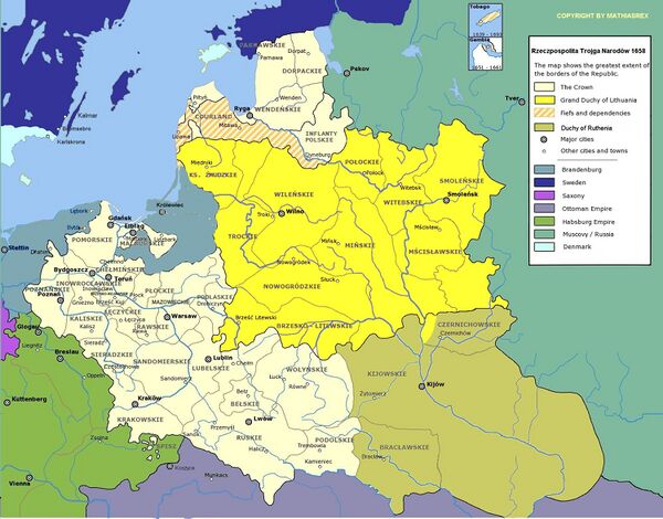 В 1648 году во время восстания под руководством Богдана Хмельницкого на освобождённых от власти Речи Посполитой территориях возникло автономное образование — Украинское гетманство[64]. В 1654 году восставшие созвали Переяславскую Раду, которая приняла решение о переходе гетманства в подданство Российского царства[65]. Это привело к русско-польской войне 1654—1667 годов. Украинское гетманство раскололось на Левобережную и Правобережную части. Первая воевала на стороне России, вторая принимала сторону то поляков, то турок[66]. По итогам войны у Российского царства осталась Северщина, Левобережная Украина и Киев, у Речи Посполитой — Правобережная Украина[67].