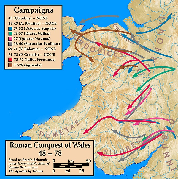 К 47 году н. э. Рим вторгся и завоевал все самые южные и юго-западные регионы Британии под предводительством первого римского наместника этой провинции. В 48 году н. э. его преемником как часть римского завоевания Британии была организована серия походов с целью завоевать Уэльс. Время от времени эти компании возобновлялись последующими наместниками, пока завоевание не было завершено в 78 году. Именно эти походы являются наиболее широко известной чертой Уэльса в римский период благодаря решительной, но неудачной защите их родины двумя местными племенами силуров и ордовиков.