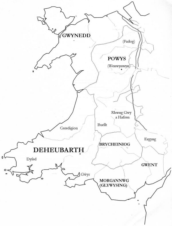 Уэльс был поделён на несколько королевств, наибольшими из которых были Гвинед на северо-западе и Поуис на востоке. Наиболее могущественным Гвинед был в VI и VII веках, во время правления таких королей как Майлгун ап Кадваллон[29] и Кадваллон ап Кадван[30], который смог в альянсе с Пендой повести своих воинов до самой Нортумбрии в 633 году, убить местного правителя Эдвина и контролировать эту территорию один год. Когда Кадваллон был убит в битве Освальдом Нортумбрийским, его преемник также объединился с Пендой против Нортумбрии, но после этого Гвинед, как и другие валлийские королевства, в основном был занят обороной от набирающей силу Мерсии.