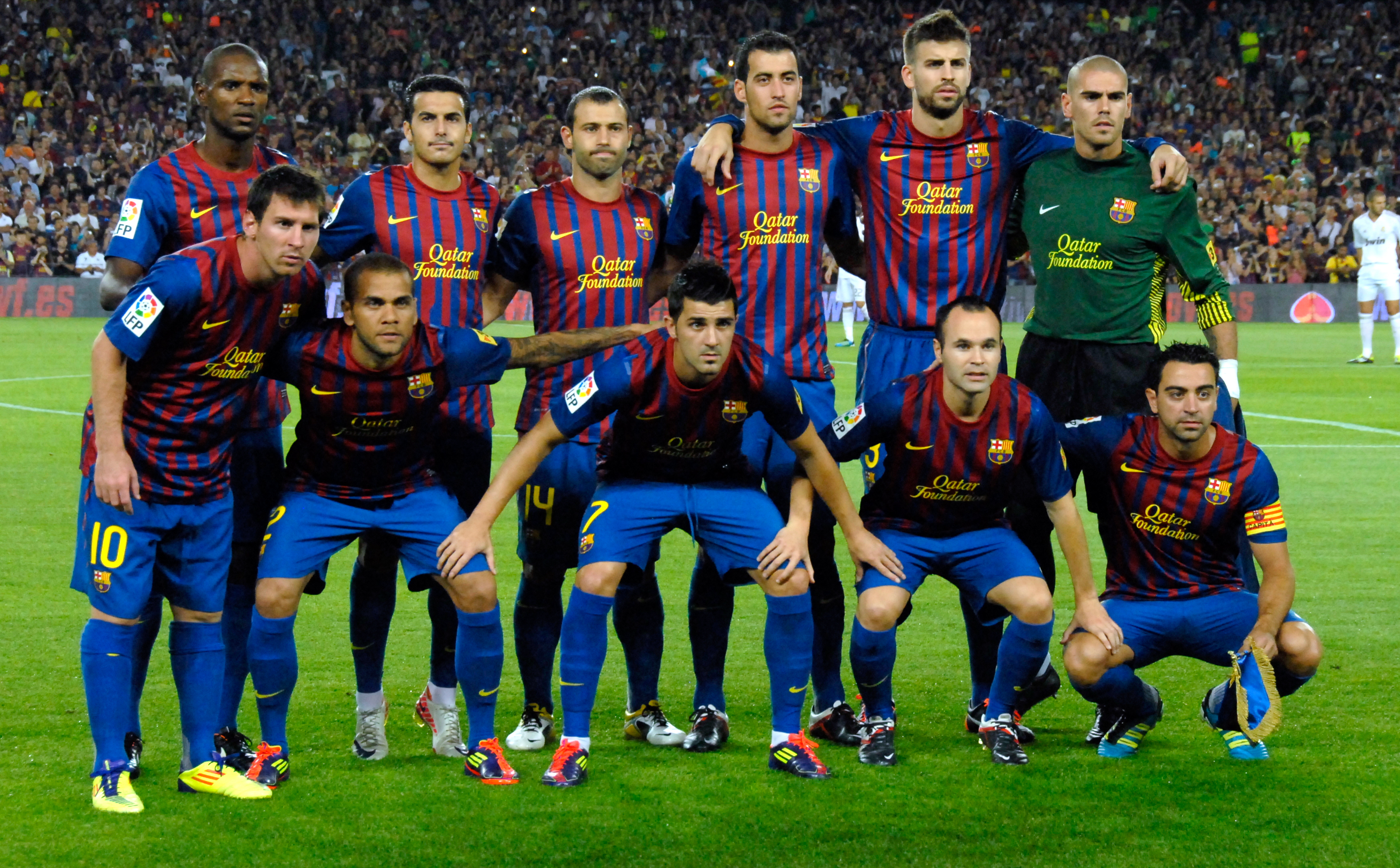 «Барселона» перед матчем за Суперкубок Испании 2011. Верхний ряд (слева направо): Эрик Абидаль, Педро Родригес, Хавьер Маскерано, Серхио Бускетс, Жерар Пике, Виктор Вальдес. Нижний ряд (слева направо): Лионель Месси, Дани Алвес, Давид Вилья, Андрес Иньеста, Хави.