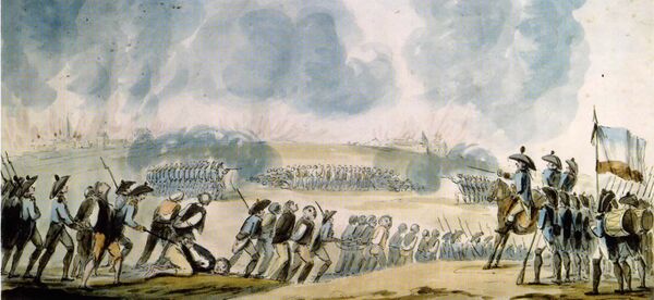 Германский «План Шлиффена» состоял в том, чтобы как можно быстрее победить французов. Немцы захватили Брюссель в Бельгии 20 августа, а вскоре и большую часть Северной Франции. Первоначально планировалось продолжить движение на юго-запад и атаковать Париж с запада. К началу сентября они находились в 65 км от Парижа, и французское правительство перебралось в Бордо. Однако союзники, наконец, остановили наступление к северо-востоку от Парижа в ходе битвы на реке Марне (5—12 сентября 1914)[157].