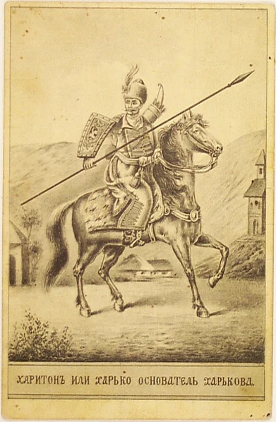 Мифический казак XVI, начала XVII или даже XVIII века Харько, по имени которого якобы назван город и которому воздвигнута в 2004 году в начале проспекта Ленина конная статуя работы З. Церетели, по поздней легенде, приведённой Н.Костомаровым (1881), был казачьим сотником, грабителем имений.[55] По другой поздней легенде, записанной Е. Топчиевым (опубликована в 1838 году), которую раскритиковал как недостоверную Д.Багалей, утонул близ будущего Змиёва в реке Северский Донец[56]: