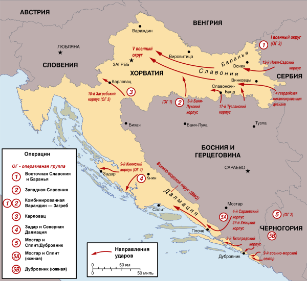 В начале 1991 года из-за спорных территорий начались вооружённые столкновения, в апреле—мае разгорелась полномасштабная война. Обе стороны осуществляли изгнание коренного населения. Хорватские войска вели бои с Югославской народной армией [225]. 25 июня 1991 года Хорватия и Словения провозгласили независимость. На сторону этих республик встала Германия. Под контролем краинских сербов и ЮНА оказалась треть территории республики[229].