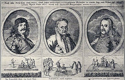 В 1669 году хорватская и венгерская знать организовала заговор против Габсбургов, результатом которого должен был стать переход под власть Османской империи на правах автономии[112]. В Загребе Ф. К. Франкопан призвал жителей города присоединиться к Петру Зринскому, потому что турки «оставят нетронутыми веру, свободу и конституцию страны». Оба хорватских магната были арестованы и 30 апреля 1671 года казнены[113].