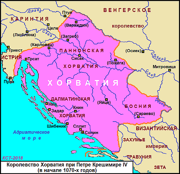 В X—XI веках в состав хорватского государства входили земли бассейнов рек Савы, Крупы до среднего течения Дравы на северо-востоке. Эта область вошла в состав Хорватии в X веке и носила название Славония (Склавония), Хорватией же часть Славонии стала называться только в XIII веке (тогда же Славония получила статус «королевства»). После захвата Венецией ряда городов и островов в Далмации в 1000 году Хорватия начала войну[60]. В 1035 году королём Хорватии-Далмации стал представитель хорватской династии Стефан, находившийся в родственных связях с венгерским королём. Тогда власть в Посавье перешла к бану[31]. Во время правления Петра Крешимира IV (1058—1073) Хорватия вернула себе города и острова. При нём хорватское государство достигло вершины своего могущества. Государство в это период состояло из Славонии, Далмации и Боснии[60]. Церковный собор в Сплите в 1060 году запретил славянам занимать церковные должности без знания латыни[61]. Приблизительно в конце 1060-х — 1070-х годах к Хорватии отошли земли между реками Цетиной и Неретвой[62]. Дмитрий-Звонимир (правл. 1074—1089) получил от папских послов знаки королевской власти, и в 1075 году признал себя вассалом папства[60]. В 1075 году ряд городов и островов Далмации были заняты норманнами, а позднее — венецианцами. После недолгого правления последнего представителя Трпимировичей — Степана (1090—1091) началась междоусобица[63]. Во время смуты в конце XI века король Венгрии Ладислав I[60], приходившийся родственником Дмитрию Звонимиру[63], подчинил Славонию, и в 1094 году основал там Загребское епископство. Загреб превратился в центр Славонии[60]. В культурном отношении раннесредневековая Хорватия находилась под влиянием Византии (церкви в Нине, Трогире, Сплите; Задарский собор IX века) и Италии (бенедиктинские монастыри[64]). В письменности кроме латыни существовала славянская литература на кириллице (недолгое время) и глаголице[65].