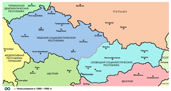В октябре 1968 года был принят, и с 1 января 1969 года вступил в силу Конституционный закон о чехословацкой федерации (№ 143/1968 Sb.)[44], в соответствии с которым унитарное государство было преобразовано в федерацию двух равноправных республик — Чешской социалистической республики и Словацкой социалистической республики[45]. Эта важнейшая реформа государственного устройства страны была начата и завершена при том же составе лидеров (Первый секретарь ЦК КПЧ — Александр Дубчек[46], председатель Национального собрания ЧССР — Йозеф Смрковский[47], премьер-министр — Олдржих Черник[48]), которые руководили страной в период Пражской весны, причём по завершении вывода войск стран-участниц Варшавского договора, введённых в Чехословакию 21 августа 1968 года.