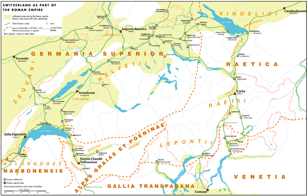 Первое важное соприкосновение швейцарских гельветов с римлянами имело место в 107 году до н. э., когда племя тигуринов присоединилось к кимврам и тевтонам и совершило набег на Южную Галлию, где на берегах Гаронны нанесло римлянам тяжёлое поражение. В 58 году до н. э. очередной набег гельветов на Южную Галлию был отражён римскими войсками под командованием Юлия Цезаря; он оттеснил их обратно на территорию Швейцарии[3].