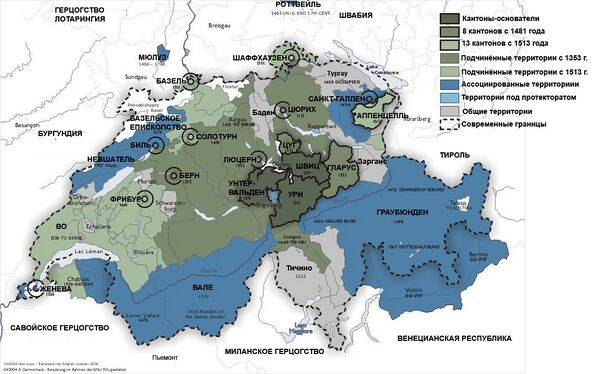 Города, вошедшие в состав Швейцарского союза, со временем получали статус вольных городов, то есть становились самостоятельными образованиями в составе Священной Римской империи. Эти города скупали земли местных обедневших аристократов и постепенно превращались в крупных землевладельцев. Города Швейцарского союза вели оживлённую торговлю с другими городами Европы, такими как Венеция, Краков, Антверпен и Лион. Вооружённые силы конфедерации были представлены добровольными отрядами молодых мужчин; многие из них становились наёмными солдатами, и это составляло значительный доход кантонов Швейцарии[2].