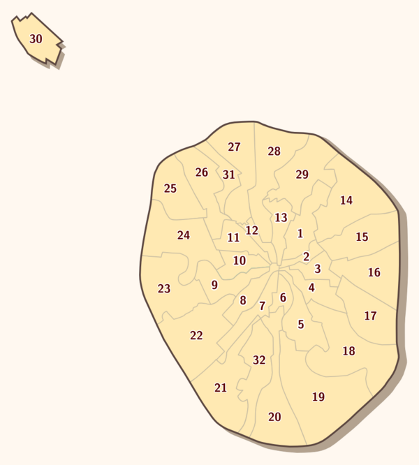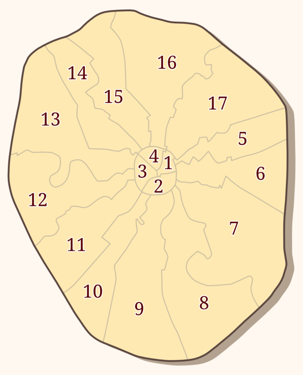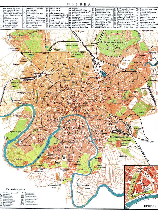 В 1852 году Москва делилась на 17 городских частей[4]. Это деление сохранялось и в 1896 году[5] (римские цифры соответствуют нумерации на карте справа):