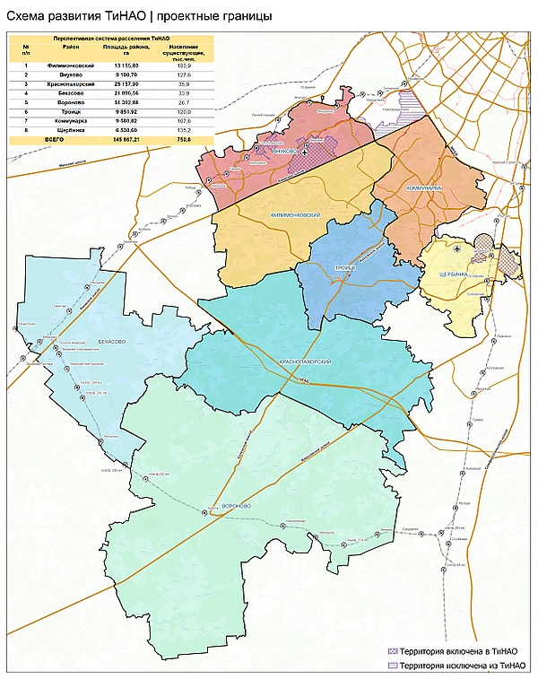 - за счёт передачи в НАО (в район Щербинка) земель на южной и юго-восточных окраинах ЮЗАО (из района Южное Бутово):