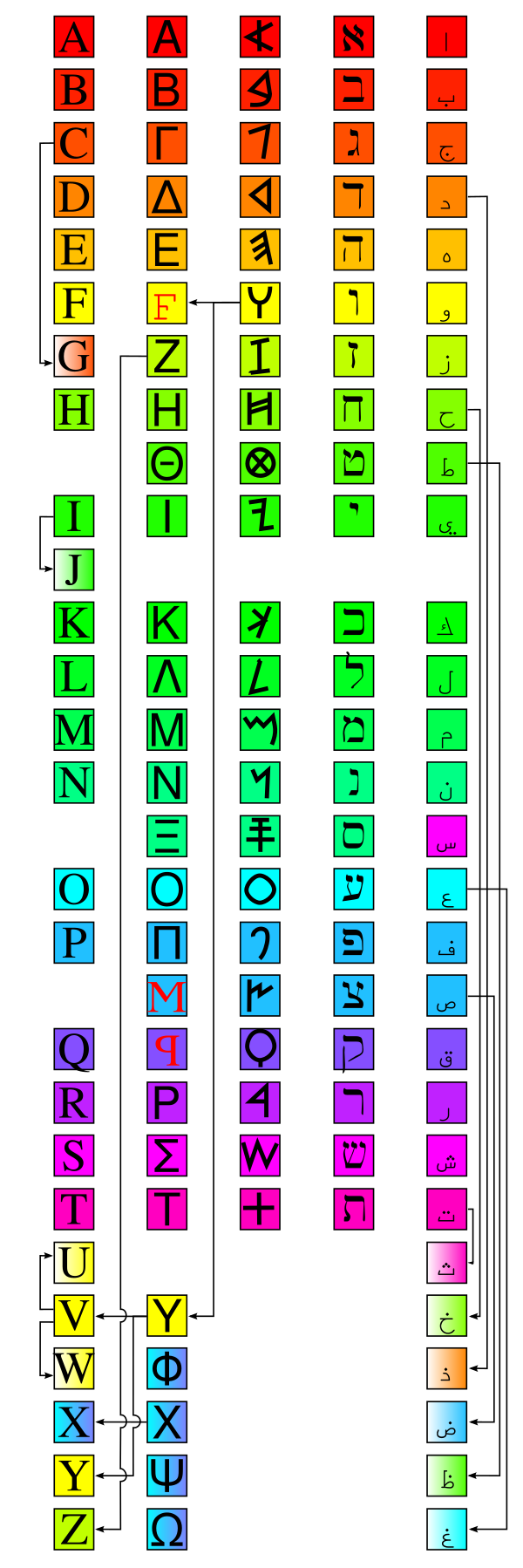 Таблица: Распространение финикийского алфавита на запад (латинский, греческий) и на восток (индийские, корейский). Соответствие финикийских и индийских (посредством арамейских) знаков (особенно передающих сибилянты и указанных в скобках), возможно, является неточным. Также спорными являются сведения о происхождении букв хангыля из тибетского алфавита (через монгольское квадратное письмо и финикийский алфавит).