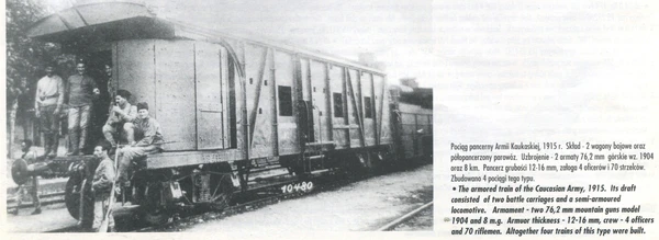 На фото внизу — типовой бронепоезд Кавказской армии постойки 1915 года. По проекту из двух бронеплощадок и полубронированного паровоза. Вооружение — две 76,2-мм горные пушки образца 1904 года во вращающихся установках в первом и последнем броневагонах с ограниченным сектором обстрела (на фото пушка не видна, виден лишь подковообразный броневой щит её амбразуры в передней части броневагона) и 8 пулемётов в бортовых амбразурах — по 4 на броневагон, команда — 4 офицера и 70 стрелков, толщина брони 12−16 мм. Построено 4 поезда этого типа[8].