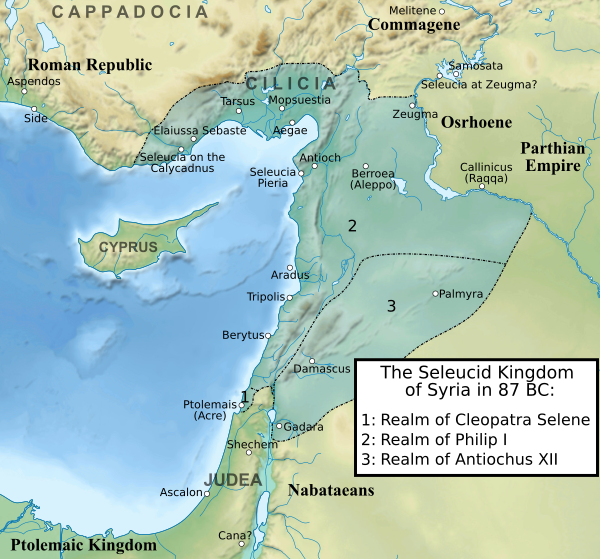 На севере греко-иранский сатрап Птолемей объявил себя царём Коммагены в 163 г. до н. э.[33], а арабские Абгариды независимо правили Осроеной с 132 г. до н. э.[34][35]. Восстание Маккавеев в Палестине открыло царство Хасмонеев в 140 г. до н. э.[36]. Набатеи на юге сохраняли своё царство с III в. до н. э.[36]. В результате Селевкидское царство стало слабым и уязвимым государством, ограниченным частью Сирии и Ливана.